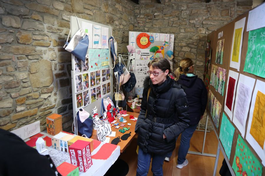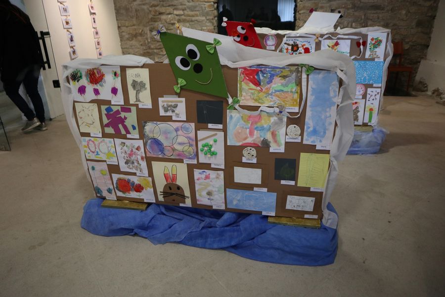 Nella prima sala sono stati esposti i lavori artistici dei bambini e delle bambine della scuola materna “L'Aquilone”, che sono stati allestiti “ad altezza bambino”, cioè in modo tale che possano essere osservati secondo la prospettiva dei piccoli artisti.