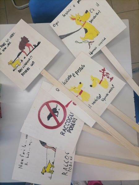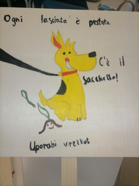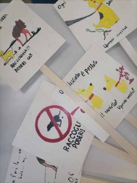 Nell'ambito del progetto: "Raccogliamo gli escrementi dei cani" gli alunni della classe Vb hanno aderito al concorso indetto dalla KOMUNALA di Isola. Hanno elaborato dei cartelli in bilingue per sollecitare i padroni dei cani a raccogliere gli escrementi dei loro amici a quattro zampe.