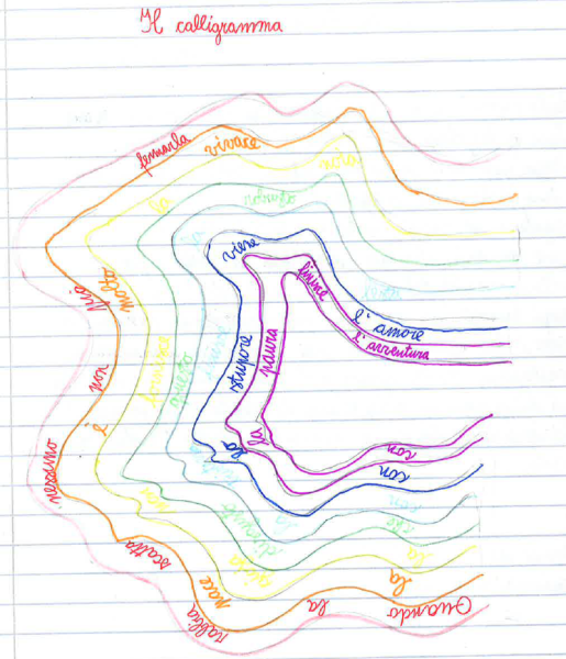 Il giorno 7 marzo, durante l'ora di lingua italiana in classe quinta, ci siamo divertiti a creare dei calligrammi, lavorando in due gruppi. Il calligramma è una poesia figurata, cioè scritta in modo da realizzare un disegno che rappresenti il soggetto della poesia stessa.