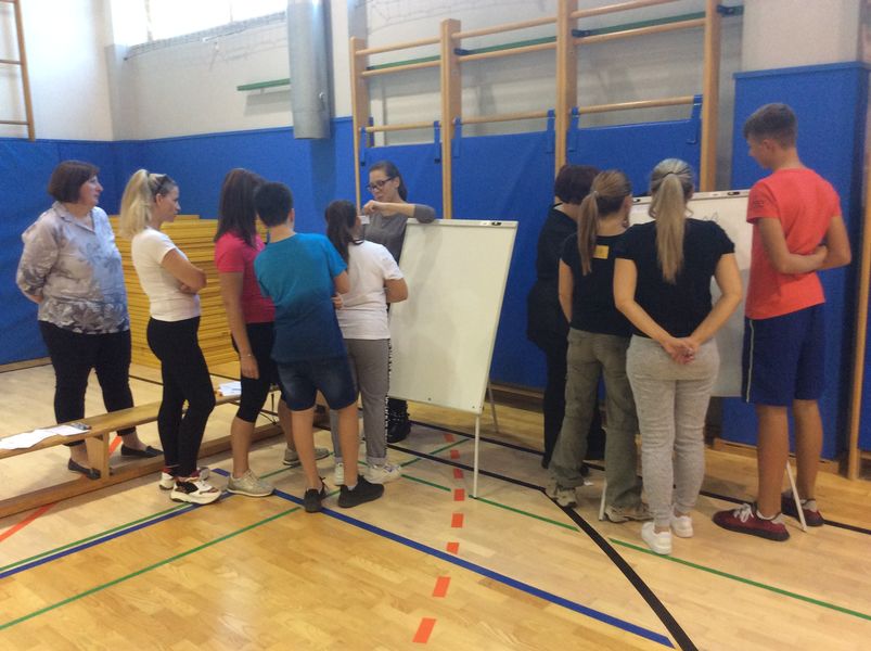Quest’anno, come il titolo “Giochi senza frontiere” illustra già da sé, si è scelto di proporre ai partecipanti, suddivisi in squadre, una serie di sfide di diverso tipo; la palestra è stata pertanto ripartita in sei spazi, ciascuno corrispondente ad un diverso gioco: un tris psico-motorio, un tiro al bersaglio con anelli e coni, un gioco con palloncini, una sfida di indovinelli, una prova di logica e un laboratorio matematico.