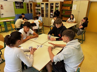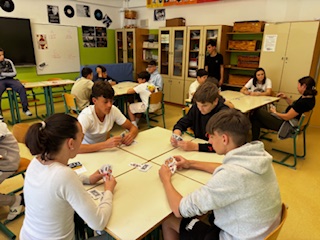 Il torneo è stato giocato con le carte di briscola istriane, create dall’Associazione Giovani CNI. Per l’occasione Dyego Tuljak, responsabile dell’Associazione Giovani ha regalato alla scuola i mazzi di carte e ha spiegato le scelte artistiche e culturali che hanno portato alla realizzazione di queste carte che rappresentano i simboli, la cultura e l’identità del territorio istriano. Denari, Coppe, Spade e Bastoni rappresentano quattro aspetti fondamentali della storia e della vita in Istria, ciascuno associato a un’immagine simbolica. I Denari sono raffigurati come cristalli di sale e richiamano il lavoro e la ricchezza, legati all’importanza del sale nell’economia locale. Le Coppe diventano anfore, simbolo dell’agricoltura e della tradizione vinicola, espressione dell’abbondanza della terra. Le Spade sono rappresentate come le “schiavone” veneziane e rimandano alla storia militare e alla vita di confine. I Bastoni, infine, sono reinterpretati come remi e rappresentano il legame con il mare, la pesca e la tradizione marittima della costa adriatica.