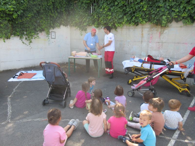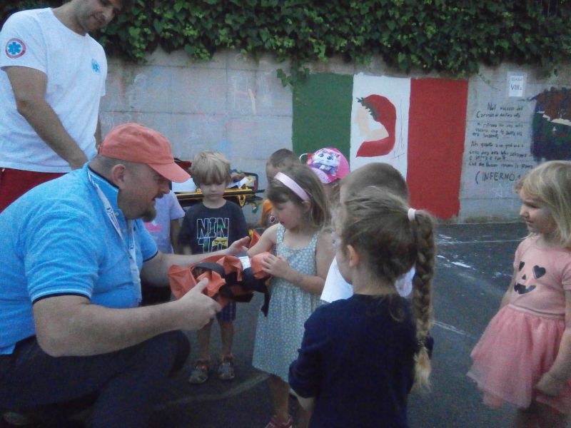 Grandissima curiosità ha suscitato la visita al mezzo che i soccorritori usano tutti i giorni, i bambini hanno potuto vedere da vicino e anche visitare l’interno dell’ambulanza, visionando l’attrezzatura sanitaria. Insieme ai soccorritori i bambini si sono trasformati in pazienti dimostrandoci assieme al personale sanitario come per esempio fissano una rottura delle ossa del braccio. Inoltre ci hanno portato anche due bambole a grandezza adulto e bambino con le quali ci hanno dato una dimostrazione di come si fa il massaggio cardiaco e della respirazione bocca a bocca.